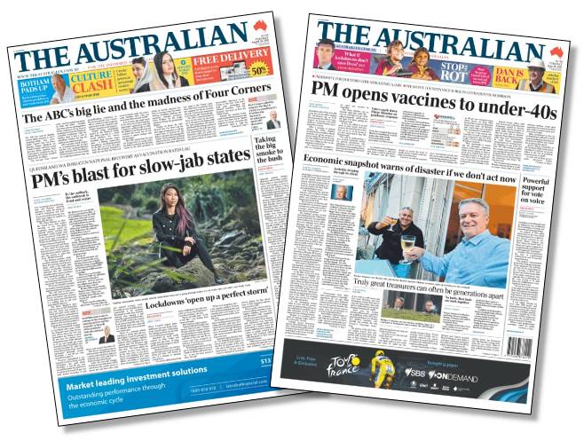 The front page on the left is from The Oz on Tuesday this week, the day after Four Corners aired its Fox News, story and shows the front-page treatment given to attacking the ABC with even more inside. The other front page is from June 29, the day after the car park rorts story broke.