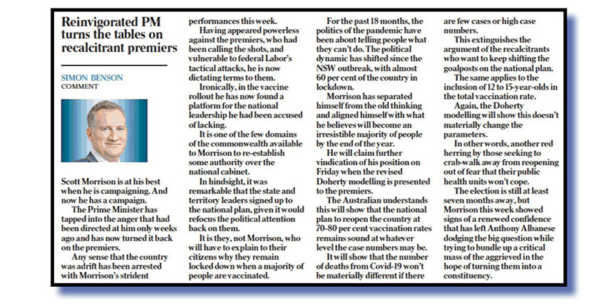 Cleary the voters of Australia have not read Simon’s brilliant, professional, balanced assessment of how his beloved leader has turned the tables on the states and territories and is now on track for a decisive win at Election 2022.