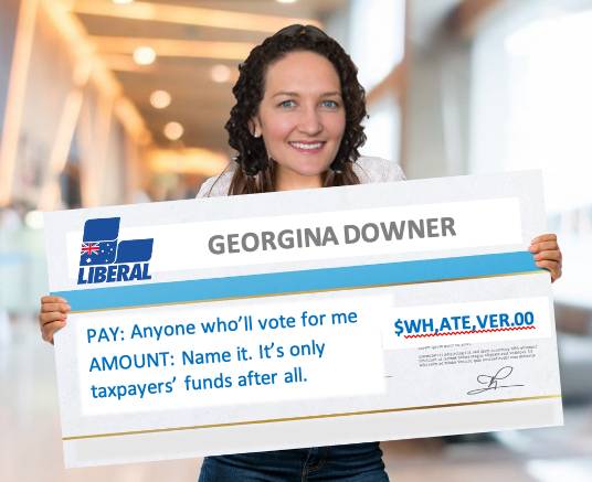 You dismiss speculation about an October election when you realise you haven’t seen a photo yet of Georgina Downer in any seat the Liberals will let her stand in holding a novelty cheque in her name made out to some local organisation from a rorted federal government community grants scheme.