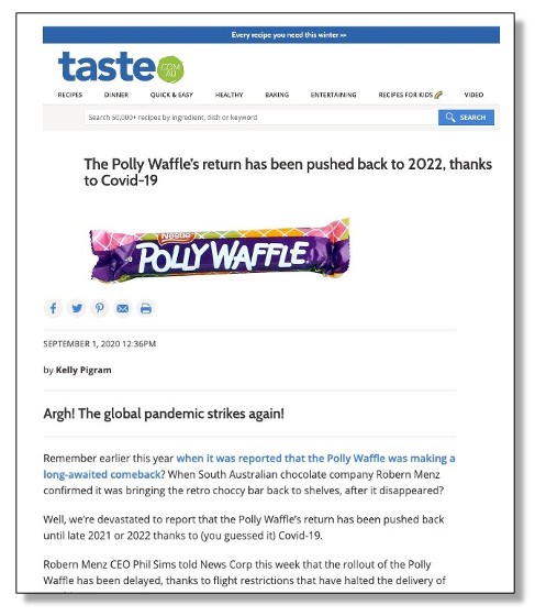 In 2019 it was announced that an Adelaide-based food company was preparing to relaunch the Polly Waffle after purchasing the rights to manufacture the once-popular chocolate-covered marshmallow treat from the global food maker Nestle. The Polly Waffle was last available on the Australian market in 2009.