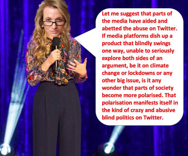 We caught Janet Albrechtsen’s routine at an inner-Sydney basement comedy club that’s defying the COVID-19 lockdown where she floored the audience with her routine riffing off a recent op-ed by the ABC 7.30’s Leigh Sales who recounted the abuse she endures on Twitter and other social media.