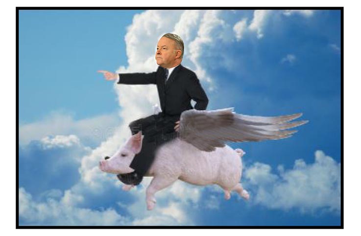 Mr Albanese then raised both fists in the air and shouted FUKAUS! FUKAUS! FUKAUS! over and over again as the sky suddenly darkened as a drift of rather large and pink-coloured pigs, too many to count despite their slow speed, flew lazily overhead.
