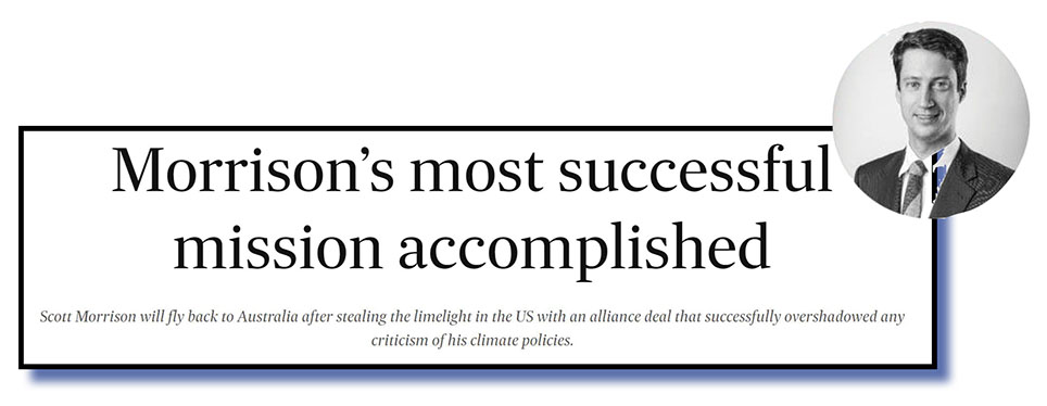 “Morrison’s most successful mission accomplished” indeed! The great man “will fly back to Australia after stealing the limelight in the US with an alliance that successfully overshadowed any criticism of his climate policies”.