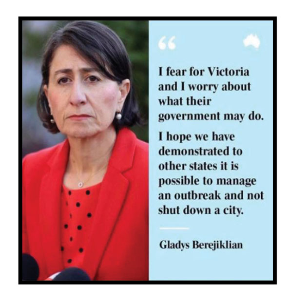 That tripe was written at a time when Gladys and her bully mate in Canberra, Smoko Morrison, were the great tag-team effort, excoriating Labor states for using lockdowns to combat COVID-19 – how dare they put people’s health before wealth! – and extolling the virtues of opening up as fast as possible so that we could all learn to live and die with COVID-19 for the economy’s sake.