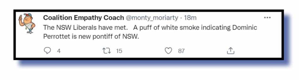 We collected other great tweets over the past week, on the issues covered above and others; His Holiness Dominic Perrottet ascending to the position of NSW Premier and one that shocked us to our very core: one of our favourite Twitterers getting all profane and profound about the rights of 50.2 per cent of the Australian population to criticise “powerful religious men” if they feel a pressing need so to do.