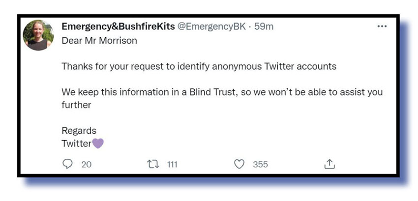 One very clever memeless take on Smoko’s attack on Twitter came from Emergency&BushfireKits (what is there not to love about Twitter handles!) ….