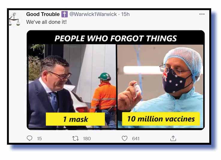 And thus it came to pass that our judges were particulary attracted to two powerful memes that sparked a lot of frenzied squeaking among the rats; Vicotorian Premier Daniel Andrews copping a fine for not masking up, and much scurring along the Twitter sewer pipe tops and high claw punches over the great man’s toothless national integrity commission and his fears of where he’ll end up under a real one.