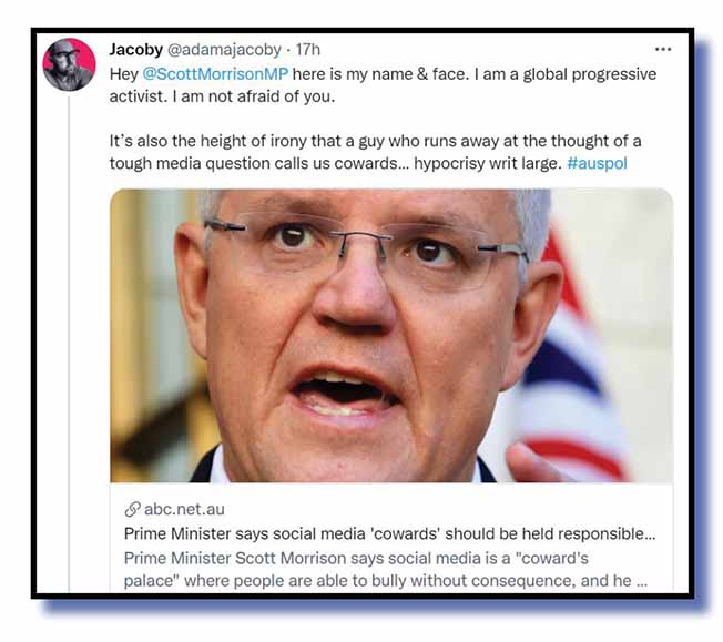 We’re not embarrassed about that. The Twitterfeed of Australia’s No1 family netzine and its journalists are unashamedly left-wing. But this was especially going to be the case in a week when the Engadine Soiler took furious aim at a media outlet that doesn’t slavishly, lavishly, give him 100 per cent support all of the time like Newscorpse does.