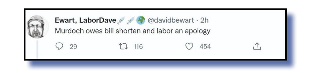 Not just Shorten and Labor, Ewart, LaborDave! All Australians and the whole world too. But don’t hold your breath. A nice deathbed confession would be nice, preferably yesterday. Fuck! Let’s hope that doesn’t put us in the Twitter naughty corner for 24 hours!