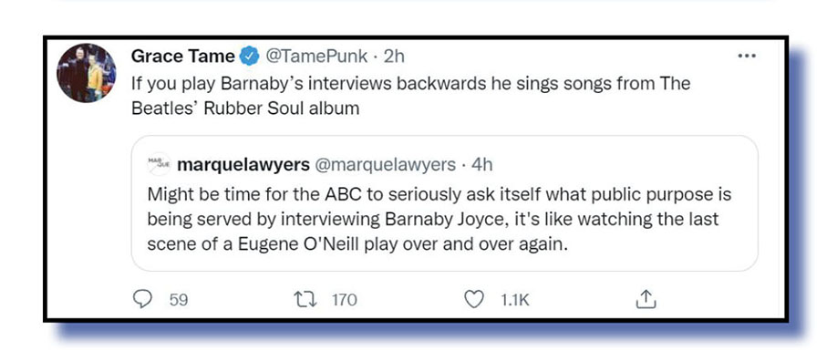And we have no idea who this Grace Tame @TamePunk is but clearly she would be no spring chicken if she can twist a tweet on a half-decade old decade rumour concerning a song by The Beatles. Grace has nailed it and if she wasn’t so political, who knows what national honours could have come her way during her lifetime.