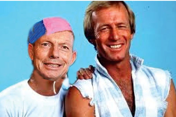 “It’s blatant plagueiarism (sic) as far as I can see,” the former Member for Warringah (pictured left, below with a friend) said: “It’s exactly the same useless, ineffective policy I concocted years ago to do fuck-all about climate change that we all knew even back then was crap and remains total crap today.”