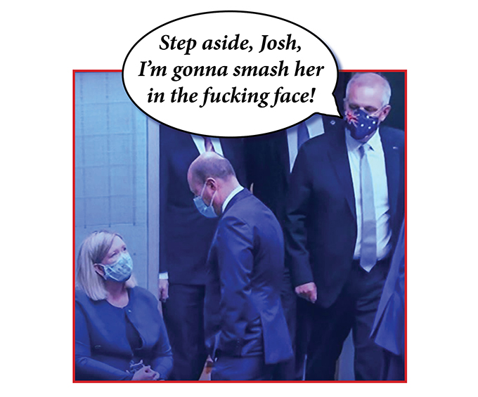 Top graphic based on an excellent Alex Ellinghausen snap showing Scott Morrison in Parliament on Thursday keen to provide some pastoral care to a Liberal backbencher.