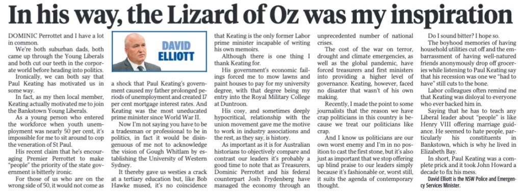 Mr Elliott makes it plain in his op-ed that he disagrees with former PM Paul Keating’s recent critique of the government of NSW Premier Dominic Perrottet.