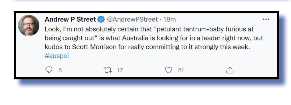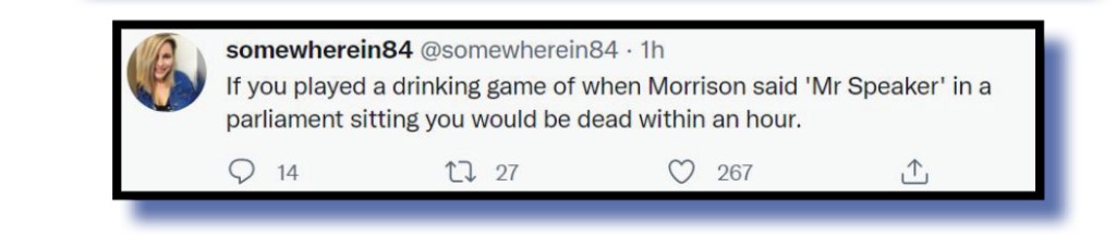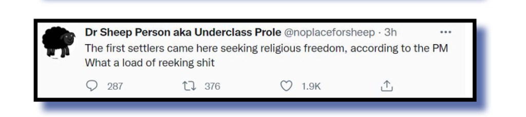 Explaining why they were sparked into action by just using words was Dr Sheep Person aka Underclass Prole @noplaceforsheep whose sharp words made us at least think: if Morrison doesn’t care what putrid muck dribbles out of his mouth, why should we? But luckily we do care, for the nation’s sake, so thanks you Dr Sheep Person etc etc.