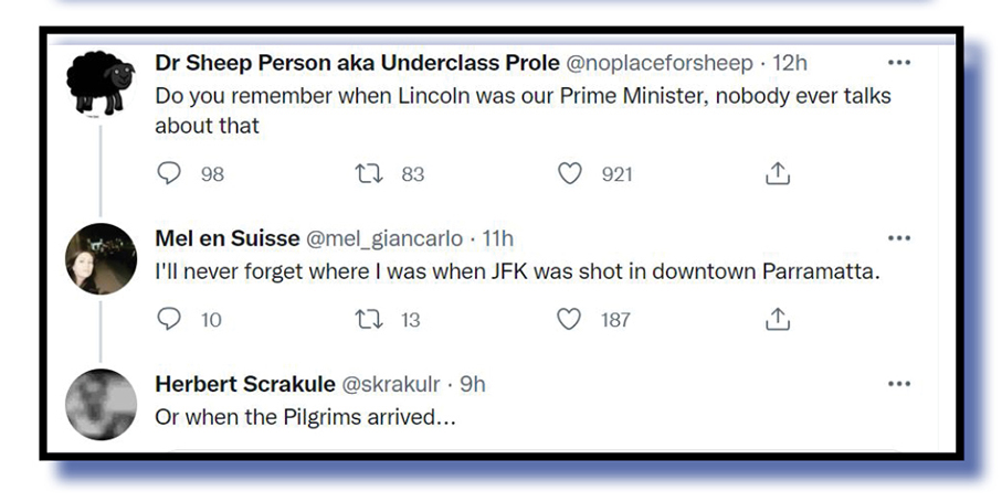 They were particularly chuffed with Twitterverse pisstakes that used wonderful imagery to debunk our great national leader’s view that all those who waded ashore back in 1788 were “seeking religious freedom”. Yeah, we know. Reeking shit, as you’ll soon read.