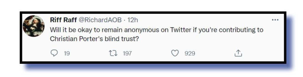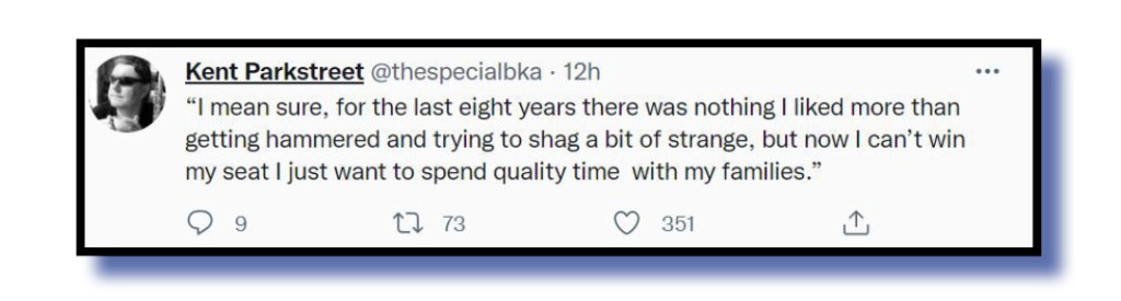 Bugsters should by now realise that The Bug‘s judges do love tweets that get a little personal – call it payback for what the Abbott/Turnbull/Morrison governments did relentlessly to Bill Shorten on the public purse for years – so we certainly appreciated this one from Kent Parkstreet @thespecialbka as he bid an unsad farewell to the retiring unChristian “I would have been a great prime minister!” Porter.
