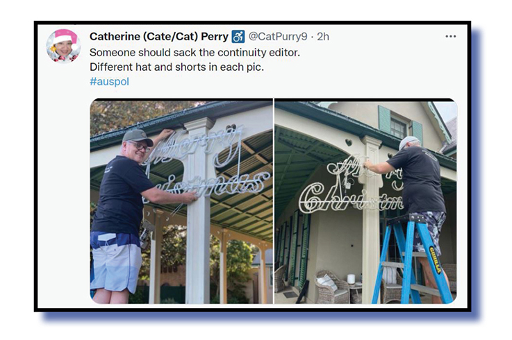 And having a nice dig at the best thing going for Labor at next year’s poll was Catherine (Cate/Cat) Perry @CatPurry9 with her astute observations as to how long it might have taken Smoko to put up a Christmas sign at Kirribilli House.