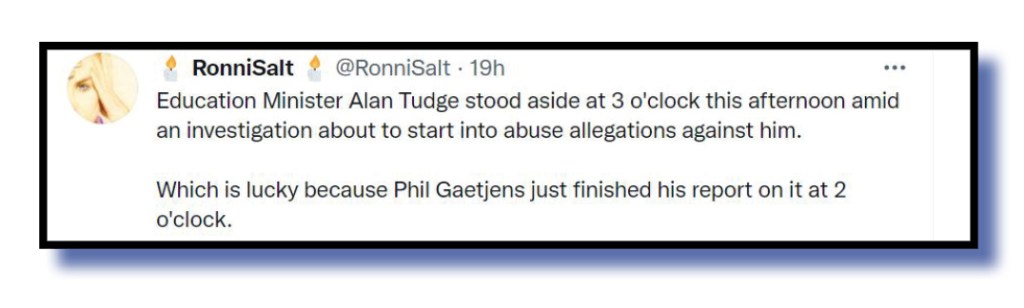While an old (sorry, Ronni!) favourite of ours RonniSalt @RonniSalt was clearly saddened when Education Minister Alan Tudge fell on his pork sword and stepped aside over allegations he kicked his female staffer out of bed at 4am for having the temerity to wake him up. To work, we mean. Not for a pre-dawn hoover. Nevertheless, Ronni was confident an inquiry into the allegations would be balanced, fair… and swift.