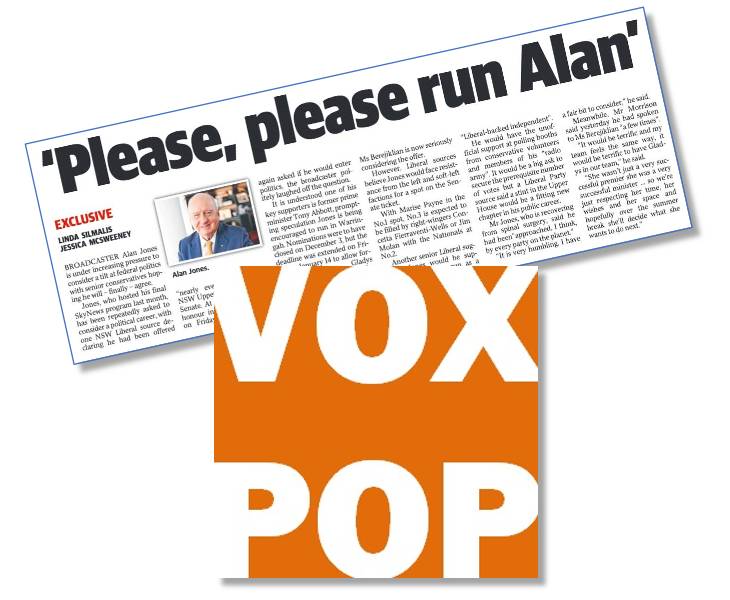 News reports suggest former radio shock jock and former Sky News “after dark” presenter Alan Jones is being touted as a Liberal Party candidate in the coming federal election. The Bug took to the streets to find out what average voters think of the idea of Jones running in the seat of Warringah.