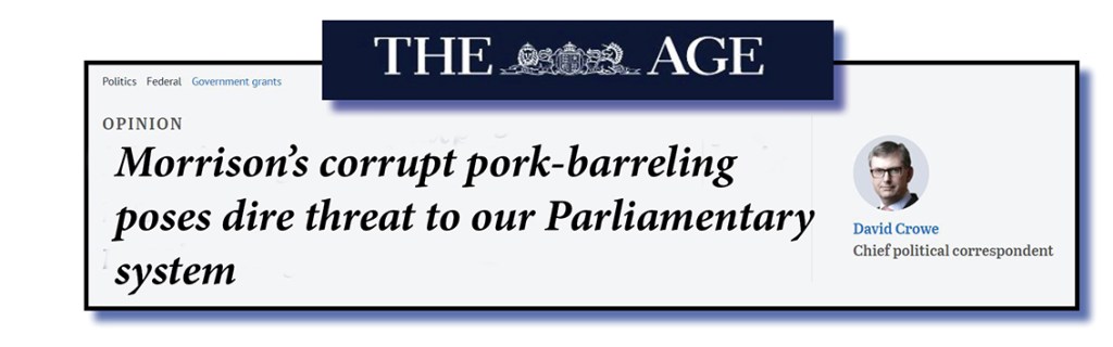 “…. this bribery is growing unchecked like a political weed, spreading so fast it could smother Parliament House in lantana. The spending is out of control – deliberately, because those who sign the grants do not want questions later.”