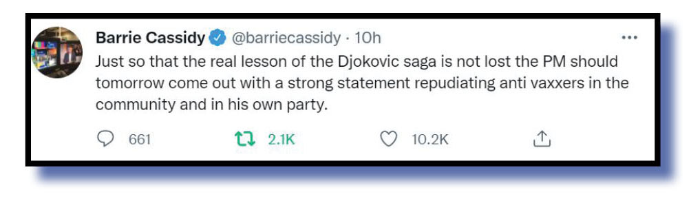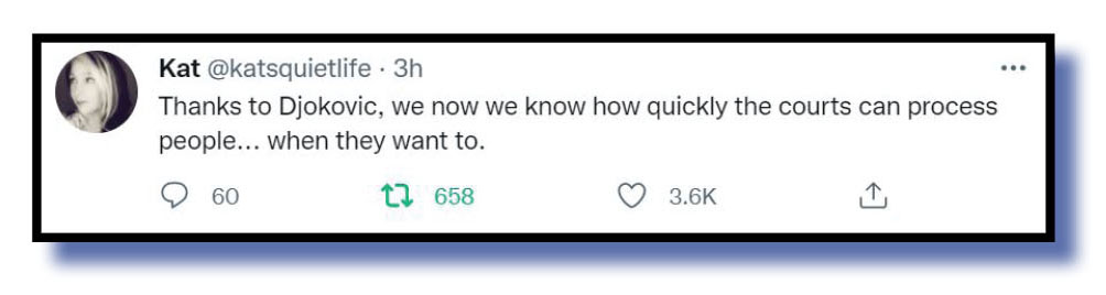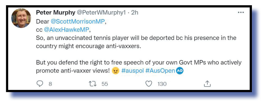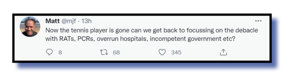 Anyway, to those other worthwhile contributions. Let’s start with the Djokovic saga and we say well done to Peter Murphy @PeterWMurphy1 who summed up matters beautifully.