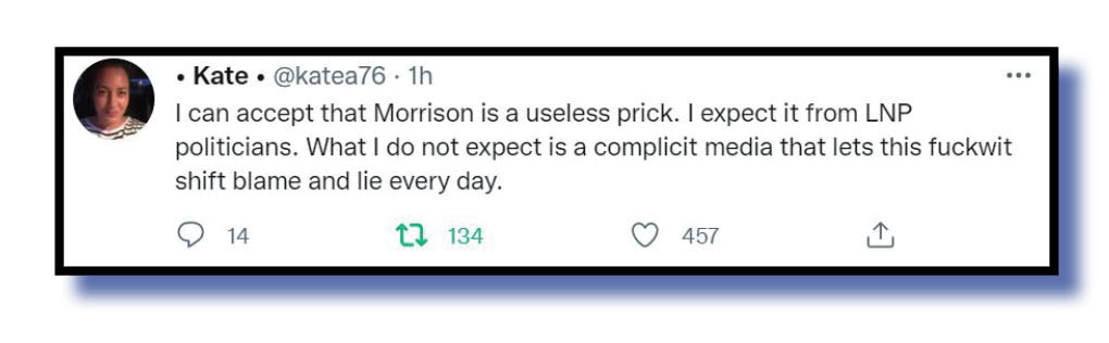 So there you have it, potential Tweet of the Week winners! There were plenty of offerings this week on the RAT plague and Novax and other issues, and all of you could have been on the winning podium if you’d just completed your observations by calling Morrison a cunt.