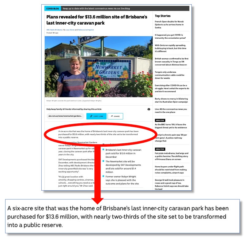This week they ran a story about “six-acre” former Brisbane caravan park site that’s set for redevelopment. (pictured)