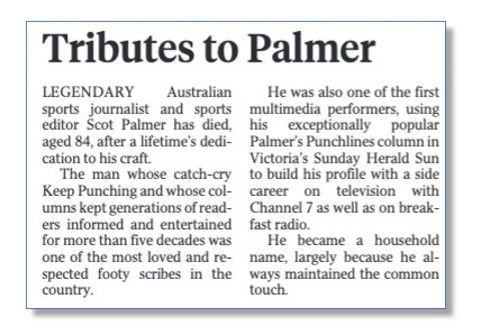Sadly, the story turned out to be one marking the passing of Scot Palmer, a well-known and popular sports reporter and editor who died recently at the age of 84 after a long and colourful career.