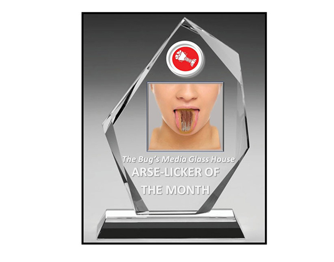 The work of two mainstream Australian journalists – one a well-known politics writer; the other a still unidentified production sub – have been released by a review panel for consideration in the uncoveted The Bug‘s Media Glass House Arse-Licker of the Year award for January.