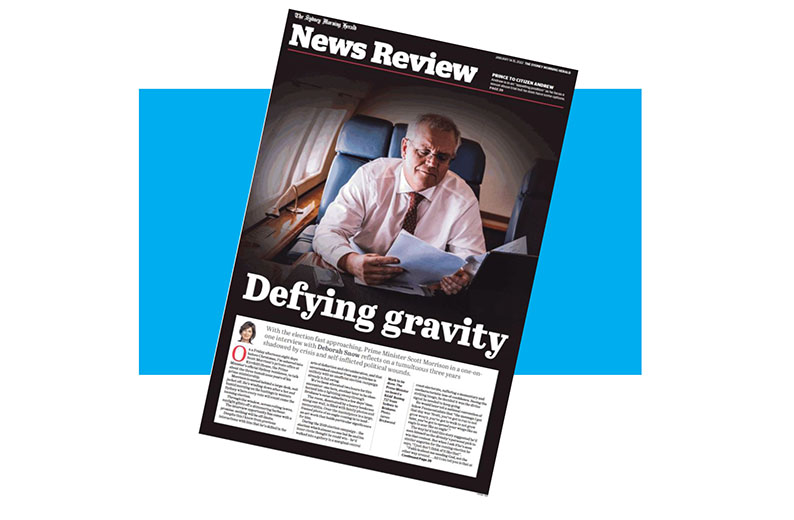 The review panel also thought the heading (below) on Snow’s piece was an absolute rip-snorter that made absolutely no sense whatsoever, unless it was meant somehow to convey the overall thought that Morrison as a master marketer and campaigner with God on his side was still standing and a real election-winning prospect despite a year of mishaps and missteps and recent horror polls.
