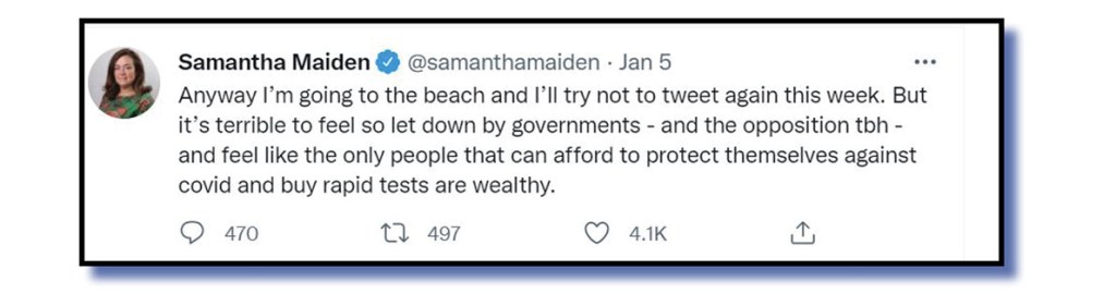 And what was Labor’s crime that made Maiden so, so terribly let down, considering the story de jour at the time really was about the Morrison’s government’s abject failure in mid-2021 to heed warnings from a number of organisations on the urgent need to access sufficient Rapid Antigen Tests to cope once the nation opened up to Covid?