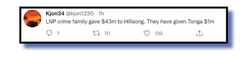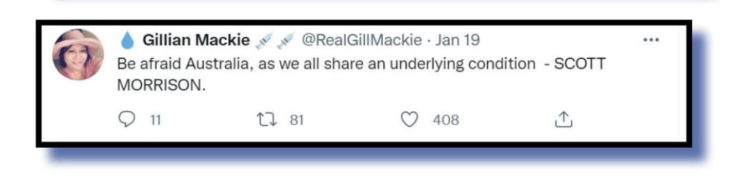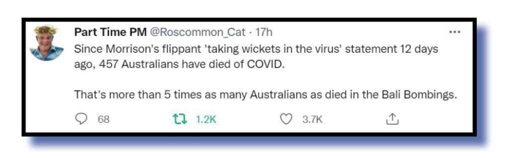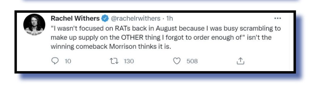 As with our winning tweet, a lot of twitterers focused on the Morrison Government’s ongoing electoral pain from their refusal in mid-2021 to heed advice from many quarters and buy enough buy Rapid Antigen Tests to deal with the upsurge in COVID once borders reopened.