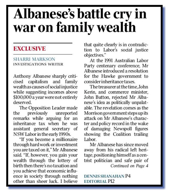 Headlined Albanese’s battle cry in war on family wealth, the article by the Oz’s investigations writer somehow miraculously coincided with the ramping up by the Morrison Government of stinging personal attacks against the federal Opposition Leader.
