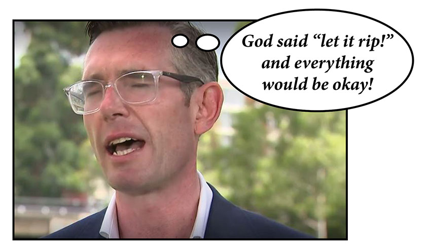“The Boy Prem… sorry … Dom told me just after he became Premier that God had come to him in a dream in the dead of night and said “Let it rip!” and “We must learn to live with Covid for the economy’s sake!”