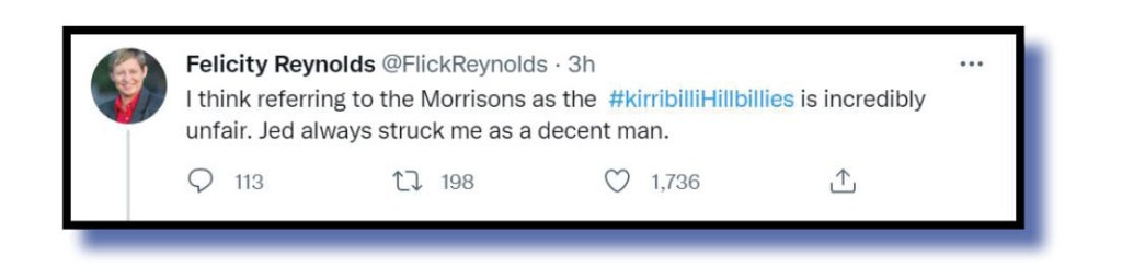 Those haunting strains of Smoko’s ukulele from last Sunday’s 60 Minutes continued to cause much mirth including the emergence – or maybe the second coming? – of the hashtag #kirribillihillbies so thanks to Kent Parkstreeet @thespecialbka and Felicity Reynolds @FlickReynolds for these two observations.