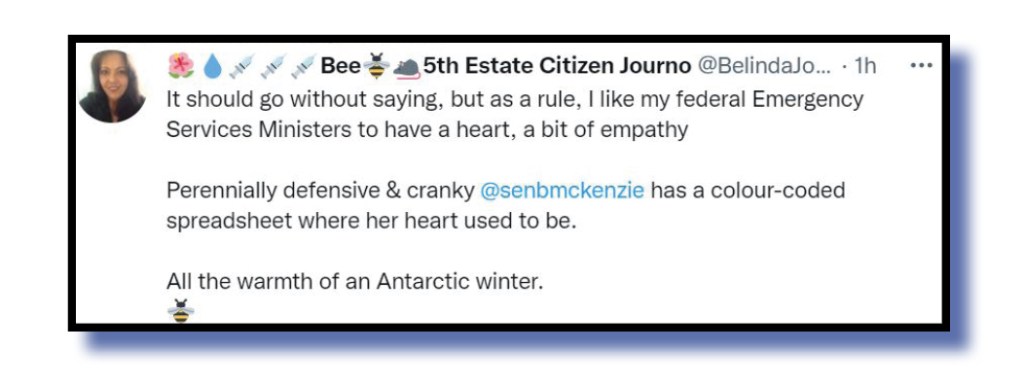 Bee 5th Estate Citizen Journo had a dig at Bridget McKenzie who more or less said the fund needed to be kept for the one-in-10,000-year flood or fire events that are due in a few years time and then again a decade from now.