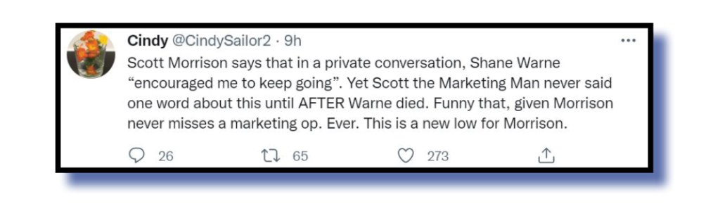 Would our current Prime Minister try to milk the tragic early death of Shane Warne for his own pathetic personal advantage? Cindy @CindySailor2 put us all straight fairly quickly…