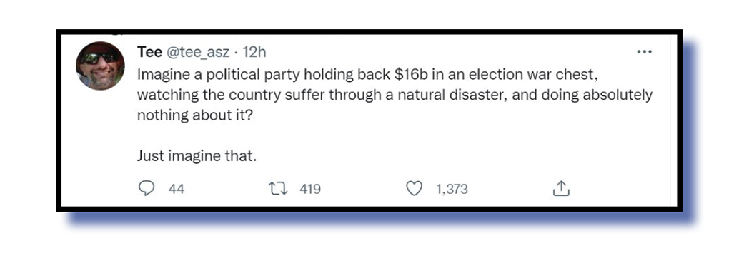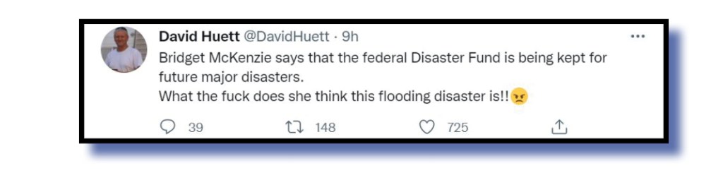 As cities and towns such as Lismore and Woodburn and many, many others decide if they’ll ever recover, the federal government’s multi-billion dollar disaster fund came in for much criticism. DavidHuett @DavidHuett summed up things pretty well.
