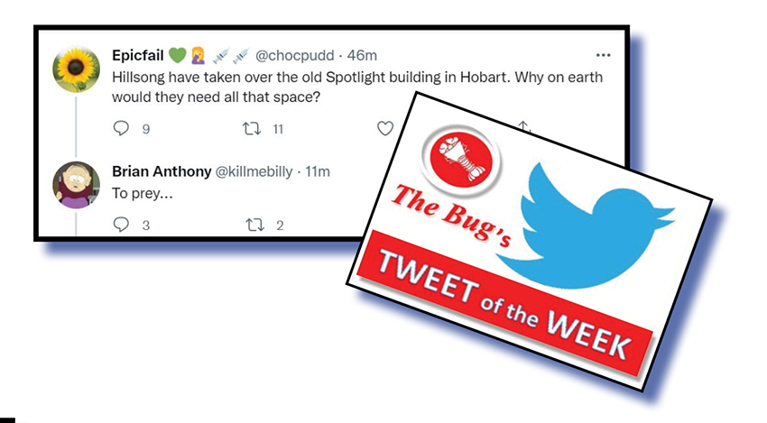 Our judges were in thrall of his short, sharp and cruelly accurate response to another twitterer, Epicfail @chocpudd who had posted: “Hillsong have taken over the old Spotlight building in Hobart. Why on earth would they need all that space?