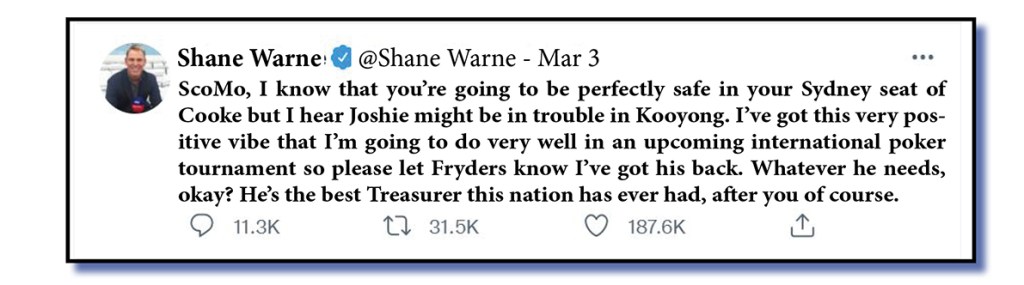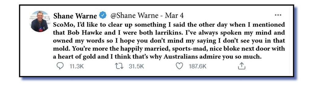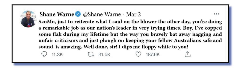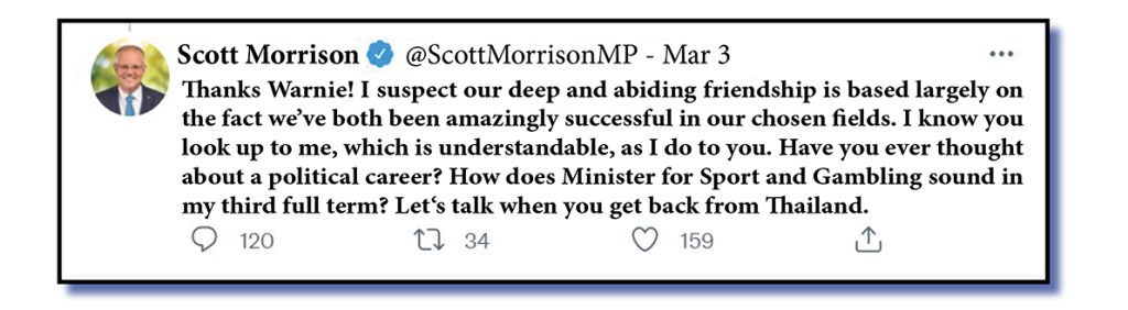 Australia’s No1 family netzine The Bug has no qualms in admitting the recent DMs between Scott Morrison and Warne over several days lobbed into its inbox overnight from a highly reliable source and is now publishing them “in the public interest”.