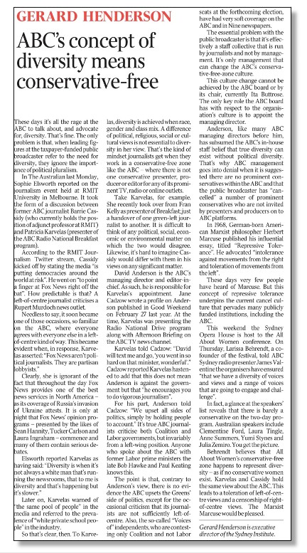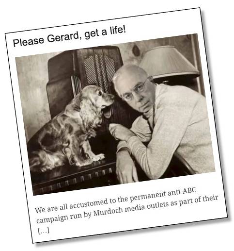This week Gerard was at it again, this time in the print edition of The Oz where he devoted his column to lambasting a range of ABC staff members and their alleged green-left bias. (pictured)