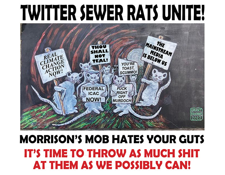 And whether the sewer rats wouldn’t be at all surprised if a desperate Frydenberg goes the same way of his Jewish colleague, Dave Sharma in his Sydney electorate of Wentworth, by not also using teal extensively but also shamelessly and gutlessly eschewing the Liberal Party’s logo, the rat replied “We’ll chew anything!”