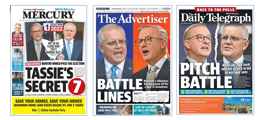 The big pic of the PM sat on top of a think piece by editor-at-largesse Paul Kelly pontificating about the coming poll as a battle between “unknown” Albanese and the “scrapping underdog” (the PM).