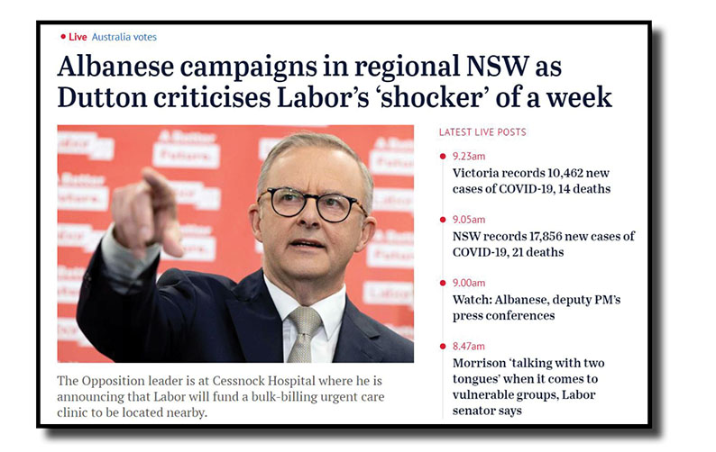 Namely that the paper thinks it’s news that Peter Dutton is criticising Labor’s “shocker” of a first week on the campaign trail. Still, Peter Costello has been head honcho at the paper’s owners for some time now so the SMH’s obvious idea of a balanced heading is news that Albanese is campaigning somewhere and Dutton is putting in the boot. It might have been news if he wasn’t.