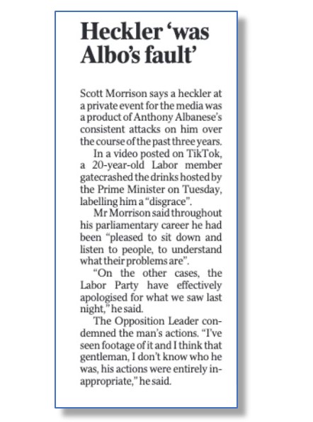 But back to The Australian. It’s headline is dead wrong. Albo is not to blame for the young heckler even though he is supposedly a Labor Party member.