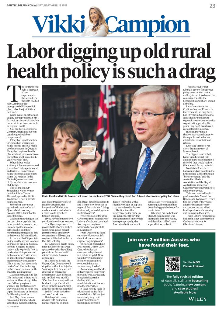 Take for example her syndicated effort at the weekend that looked at the Labor Party’s election policy for establishing 50 special urgent-care clinics across the nation. (pictured)