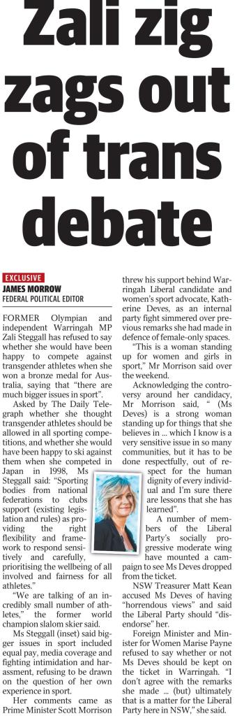 There has been considerable debate about the comments on the transgender issue by Katherine Deves, the “captain’s pick” by PM Scott Morrison to be the Liberal candidate in the seat of Warringah held by independent Zali Steggall since she gave Tony Abbott the boot in 2019.