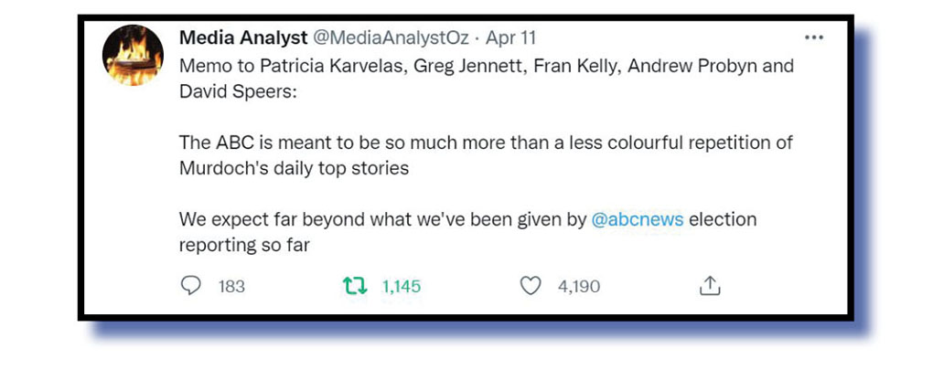 Also targetting the ABC was Media Analyst @MediaAnalystOz with some sound advice for some of Aunty’s alleged superstars….
