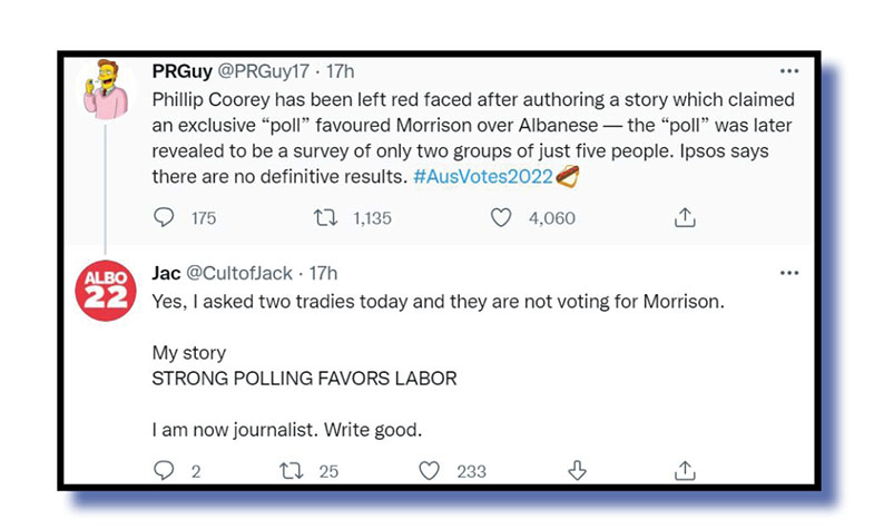 Probably the biggest MSM political news of the week, apart from poor old Albanese ruining his chances of ever being PM on the first full day of campaigning was an enormous howler from The Australian Financial Review that left Michael Stutchbury and Phillip Coorey with egg all over their faces, as PRGuy @PRGuy17 explained in a reply to a tweet by Jac @CultofJack..