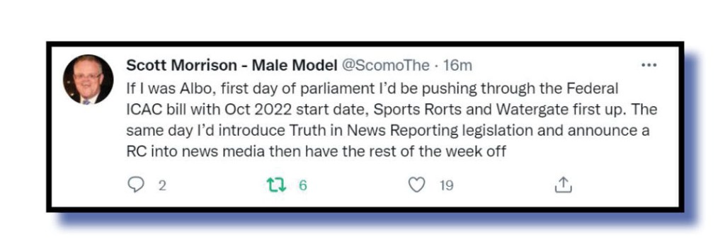 Federal ICAC now @swansraiders, Adam Of Smeg @adamofsmeg and Scott Morrison Male Model @ScomoThe tweeted on various issues of interest…